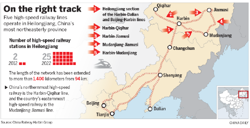 China Railway Harbin Group, the operator of the regional railway, said the number of high-speed railway stations in Heilongjiang has risen from two in 2012 to 25, while the network has extended to more than 1,400 kilometers from 94 km.