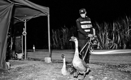 When Liao is ready to patrol the border, the two geese follow his steps as if reaching a tacit agreement.
