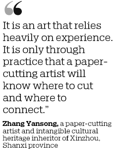When she travels back in time to her childhood in Xinzhou, Shanxi province, Zhang Yansong hears the sweet, melodious chirps of magpies combined by the controlled yet euphonious snips of a pair of scissors her grandma used to employ to cut papers. This is how the 49-year-old paper-cutting artist remembers the days she spent in her hometown.