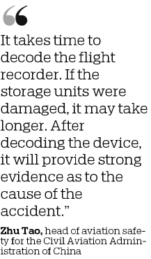 "It takes time to decode the flight recorder. If the storage units were damaged, it may take longer. After decoding the device, it will provide strong evidence as to the cause of the accident," Zhu Tao, head of aviation safety for the CAAC, said at an earlier news conference.
