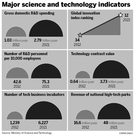 China's ranking in the Global Innovation Index rose from 34th in 2012 to 12th in 2021, Wang said. The country's gross domestic research and development budget more than doubled from 1.03 trillion yuan ($150 billion) in 2012 to 2.79 trillion yuan last year.