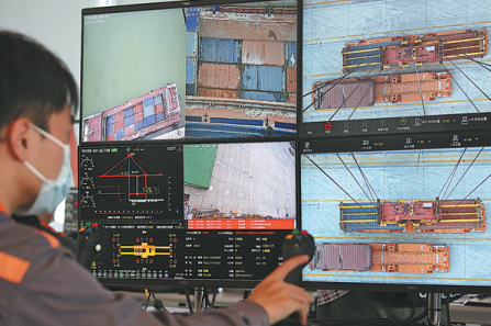 The bridge cranes, which load the containers on and off vessels, are controlled remotely from the intelligent operation center. Research is being undertaken to further automate the cranes, which Xu said needs to take into account the effect of constantly changing water levels and waves.
