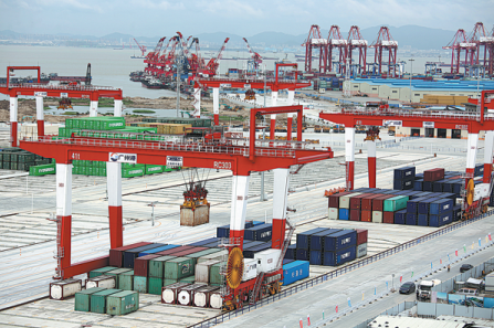 Cargo containers are automatically handled after they are unloaded from trucks in the fourth phase of Nansha Port, the first port of its kind in the Guangdong-Hong Kong-Macao Greater Bay Area.