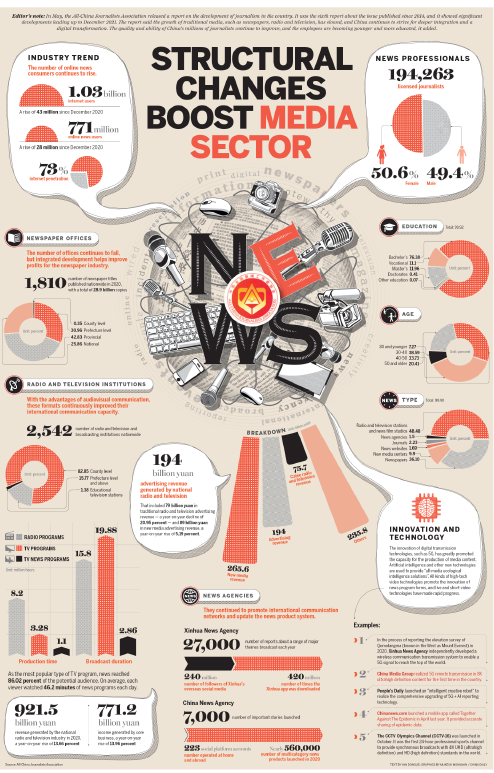 Editor's note: In May, the All-China Journalists Association released a report on the development of journalism in the country. It was the sixth report about the issue published since 2014, and it showed significant developments leading up to December 2021. The report said the growth of traditional media, such as newspapers, radio and television, has slowed, and China continues to strive for deeper integration and a digital transformation. The quality and ability of China's millions of journalists continue to improve, and the employees are becoming younger and more educated, it added.