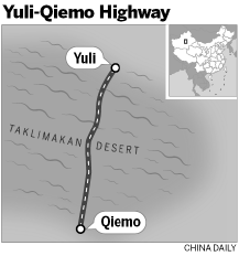 The 334-kilometer highway, linking Yuli and Qiemo counties in the Bayingolin Mongol autonomous prefecture of Xinjiang, is located at the Tarim Basin between the southern slope of the Tianshan Mountains and north side of the Altun Mountains.