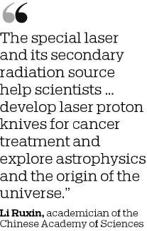 "The special laser and its secondary radiation source help scientists hunt for the movements of active ingredients in living things, reveal the mysteries of life, develop laser proton knives for cancer treatment and explore astrophysics and the origin of the universe," Li said.