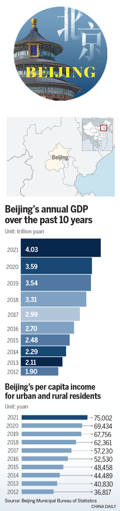 Last year, Beijing's GDP passed the 4 trillion yuan ($570 billion) mark for the first time, a year-on-year increase of 8.5 percent, and the city government aims to raise that figure to 5 trillion yuan in the next five years through a substantially stronger economy based on the high-tech sector.