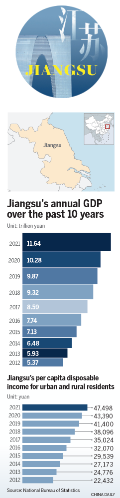 Last year, GDP hit a record high of 11.64 trillion yuan, accounting for 10.2 percent of the national economy, according to the Jiangsu Bureau of Statistics. From 2013 to 2021, GDP rose by an average of 7.4 percent every year, nearly 1 percentage point higher than the national average.