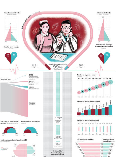 Editor's note: To mark the 20th National Congress of the Communist Party of China, China Daily is producing a series of data graphics pages to mark the nation's major achievements during the past decade. This, the second in the series, relates to healthcare. It shows the expansion of prenatal care, the decline in infant mortality, and the growing number of people employed in the sector.
