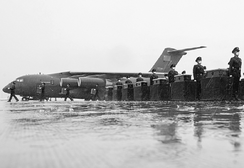 After landing at Shenyang Taoxian International Airport, the 88 caskets and 837 related belongings were removed from the plane and displayed in front of Party and government officials, military personnel, family members and members of the public for a brief remembrance ritual.