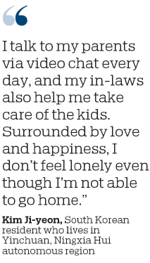 "I talk to my parents via video chat every day, and my in-laws also help me take care of the kids. Surrounded by love and happiness, I don't feel lonely even though I'm not able to go home," Kim said.
