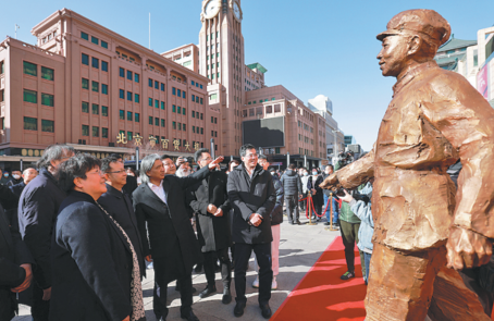 The sculpture by Wu depicts the soldier walking and smiling in the pleasant spring breeze. Its installation in Wangfujing also symbolizes the beginning of a long-term collaboration between the National Art Museum of China and Dongcheng district, which administers Wangfujing, to place more statues of heroic figures in public places.