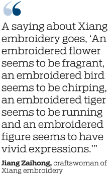 "A saying about Xiang embroidery goes, 'An embroidered flower seems to be fragrant, an embroidered bird seems to be chirping, an embroidered tiger seems to be running and an embroidered figure seems to have vivid expressions,'" says Jiang.
