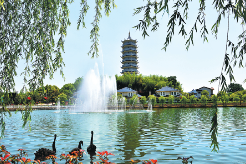 Many go up to the Wenchang Pagoda, which is nine stories tall and stands at a height of 59 meters. The pagoda, constructed in traditional fashion, was built at a cost of 100 million yuan ($14.5 million). It is a landmark of the park and takes only minutes to reach the top, thanks to an elevator inside. Looking down from the apex, visitors who have stayed long in big cities are overwhelmed by the green bamboo trees all around, and hills and lakes in the distance.