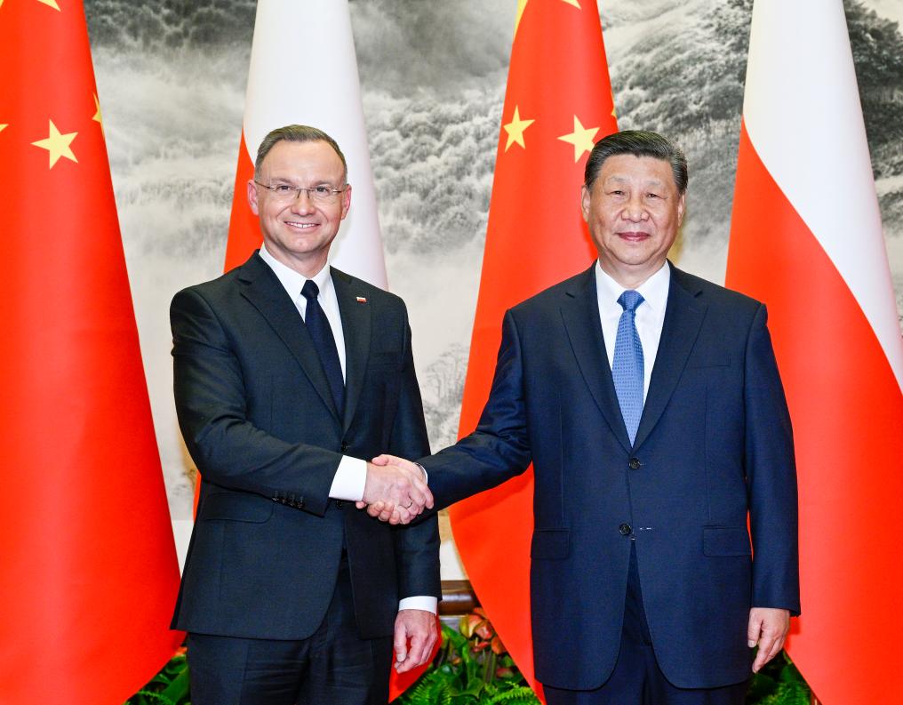 Chinese President Xi Jinping shakes hands with Polish President Andrzej Duda, who is on a state visit to China, in Beijing, capital of China, June 24, 2024. Xi held talks with Duda at the Great Hall of the People in Beijing on Monday. [Photo/Xinhua]