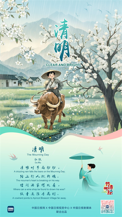 At Qingming, we honor the past and welcome the new. As fine threads of gray kiss the ground with grace, souls in sorrow wander, lost in time's embrace. May the gentleness of Du Mu's poem "Qingming" soothe your heart, and life be as bright as the season's start. #CulturalJourney #24Solar Terms