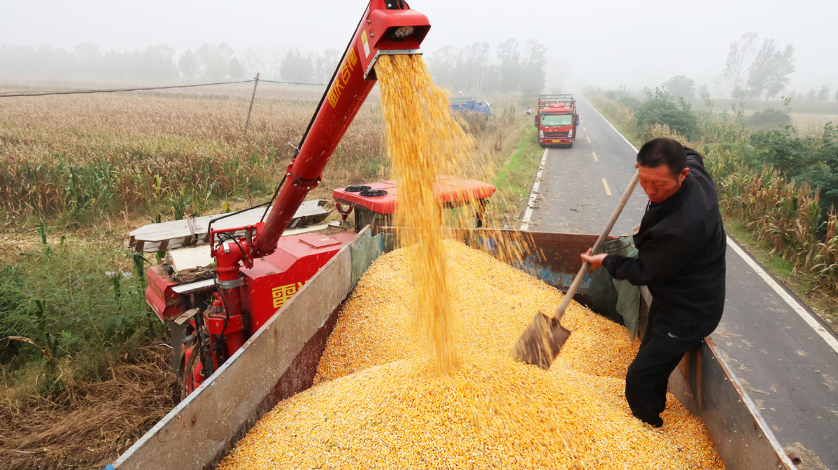 A farmer uses a shovel to arrange corn in Haizhou district, Lianyungang city, East China's Jiangsu province, Oct 11, 2025. [Photo/Xinhua]