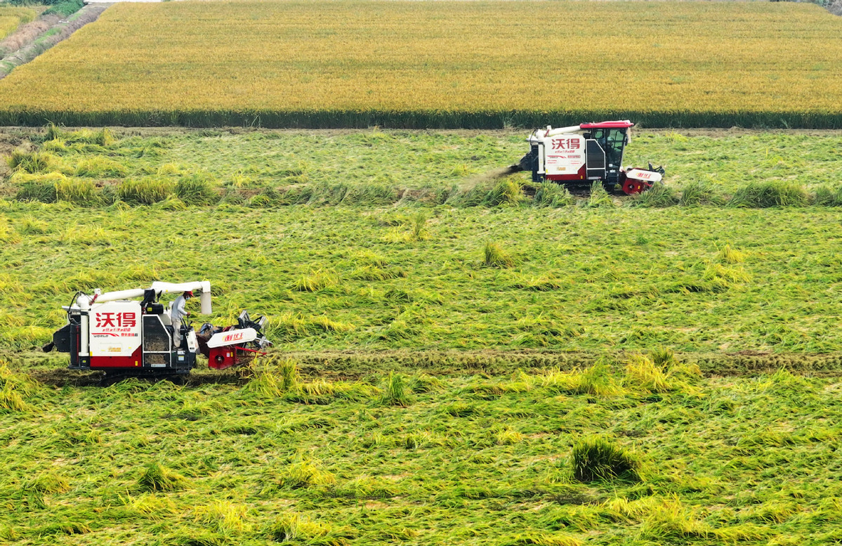 An aerial drone photo taken on Oct 11, 2025 shows harvesters working at a field in Gongdao town, Yangzhou city, East China's Jiangsu province. [Photo/Xinhua]