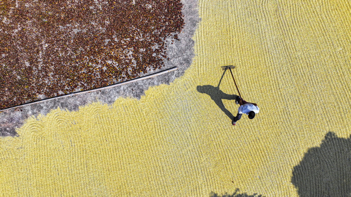 An aerial drone photo taken on Oct 11, 2025 shows a farmer spreading rice to dry in Lanjiang township, Changning city, Central China's Hunan province. [Photo/Xinhua]