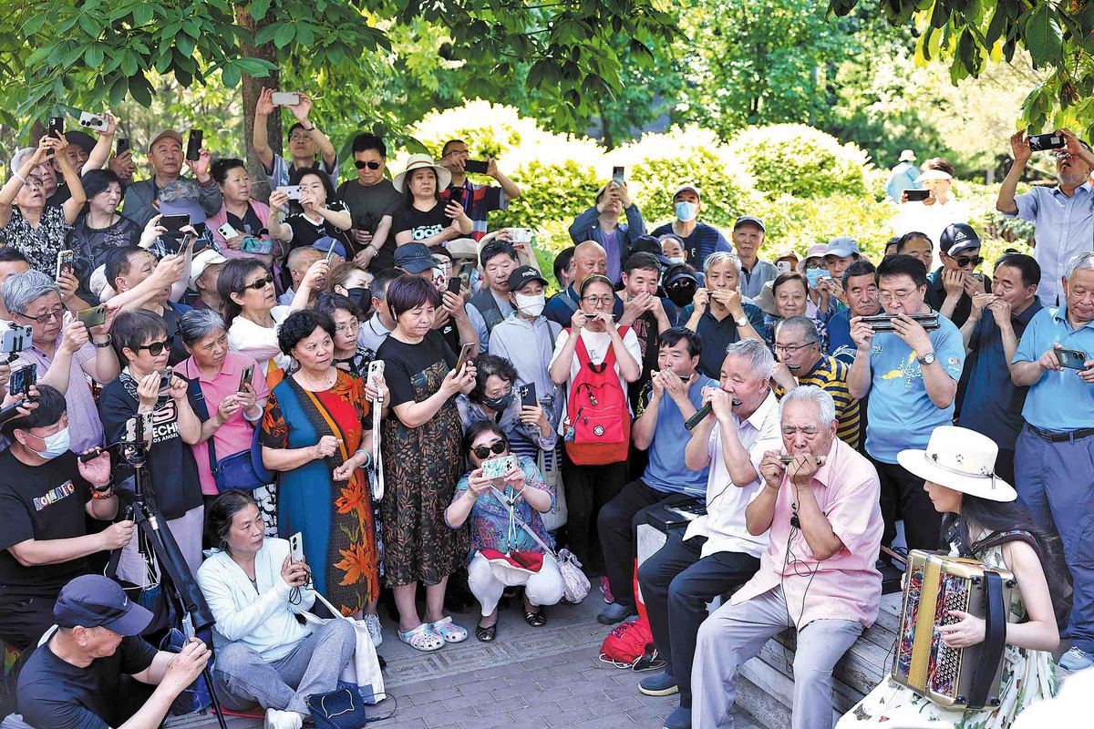 Wang Zhixiang and Fan Kaijian (front row), dubbed "Harmonica Grandpas" by online fans, performs a string of children's songs while drawing fans to join the performance in Beijing in May last year. ZHANG YU/CHINA NEWS SERVICE