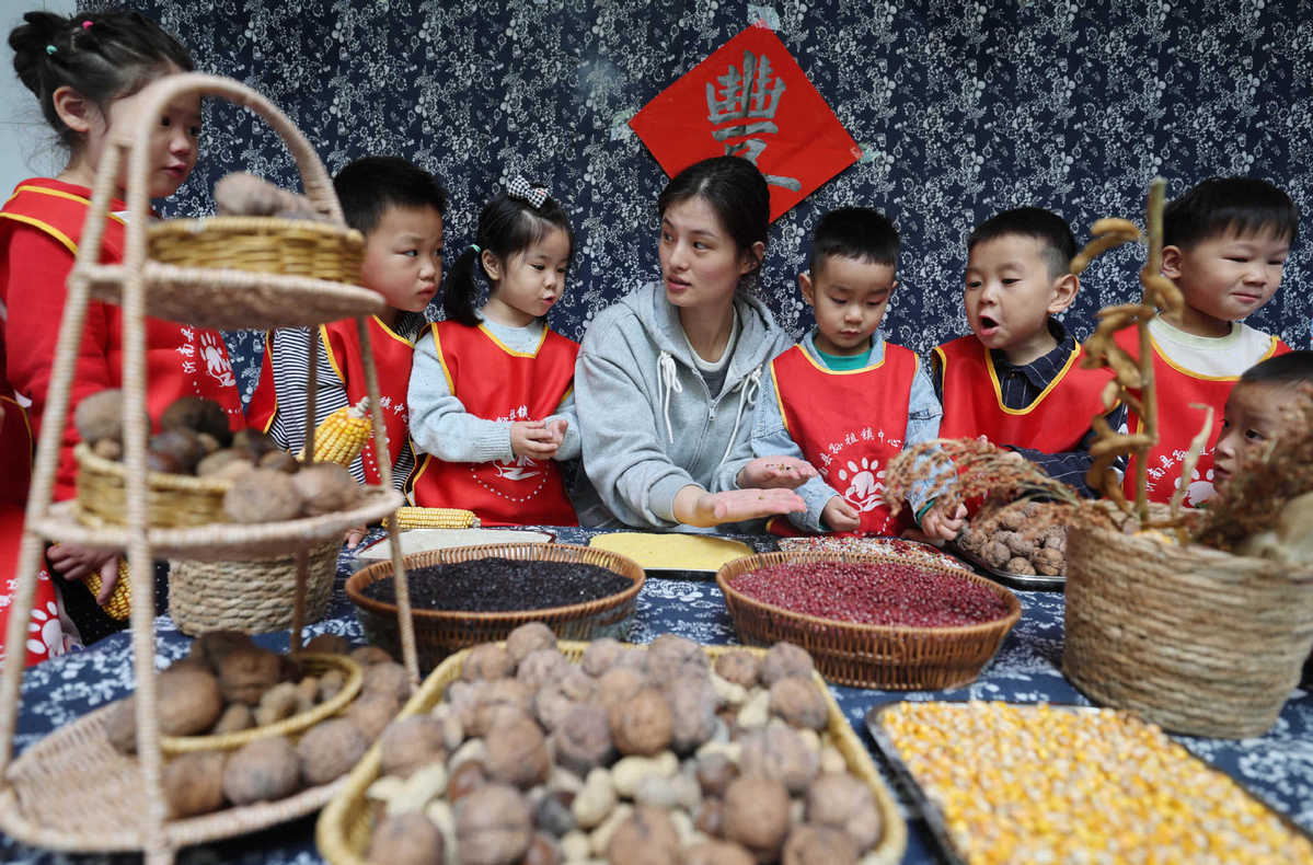 Children learn knowledge about grain under the guidance of a teacher at a kindergarten in Yinan county of Linyi city, East China's Shandong province, Oct 14, 2025. Theme events have been carried out across China to mark World Food Day that falls on Oct 16 annually. [Photo/Xinhua]