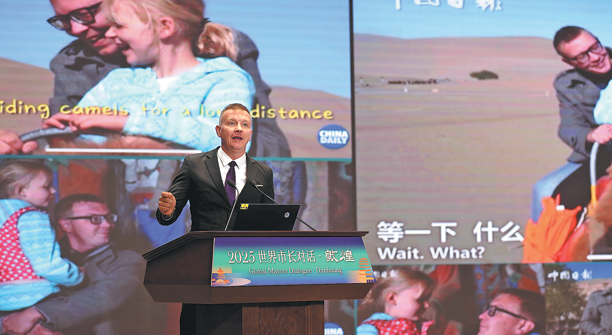 Erik Nilsson, a US journalist with China Daily, shares on Monday his insights and stories about Dunhuang at the event. CHEN ZEBING/CHINA DAILY