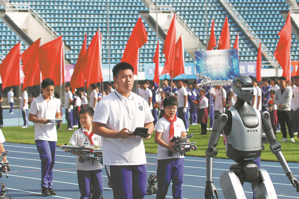 Zhang Yi (center), a student at Guangqumen Middle School, manipulates a humanoid at the opening ceremony of his school's sports meeting on Sept 26 in Beijing. [Photo provided to China Daily]