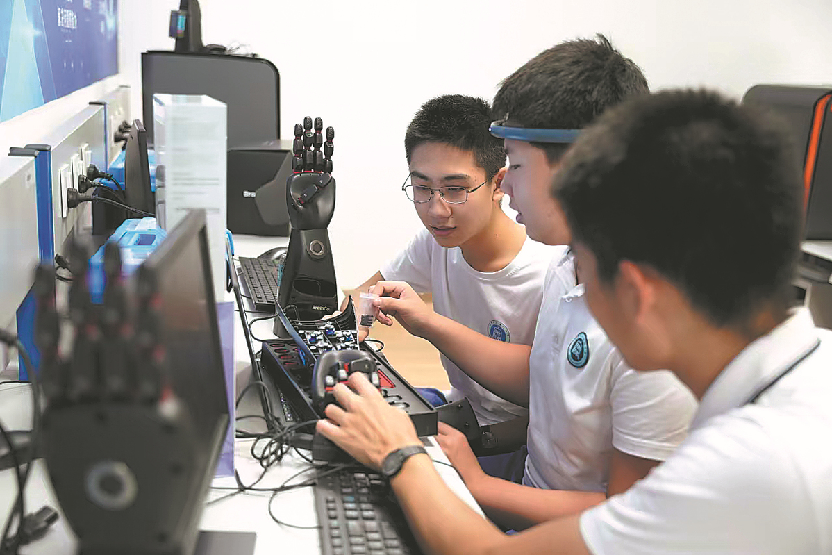 Students from Guangqumen Middle School operate a robotic arm with a smart headband during an AI class in Beijing last month. [Photo provided to China Daily]