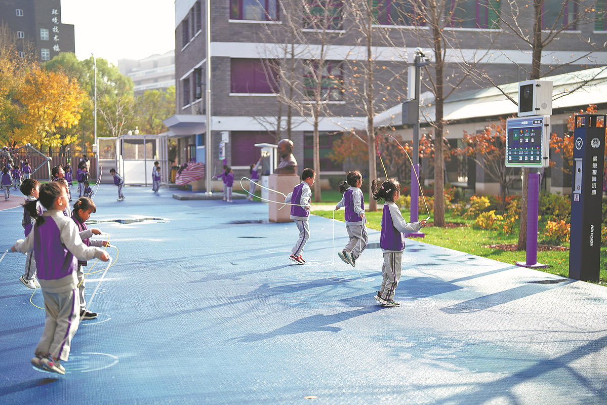 Students at Tsinghua University's affiliated primary school jump rope while artificial intelligence devices analyze their exercise intensity and provide suggestions. [Photo provided to China Daily]