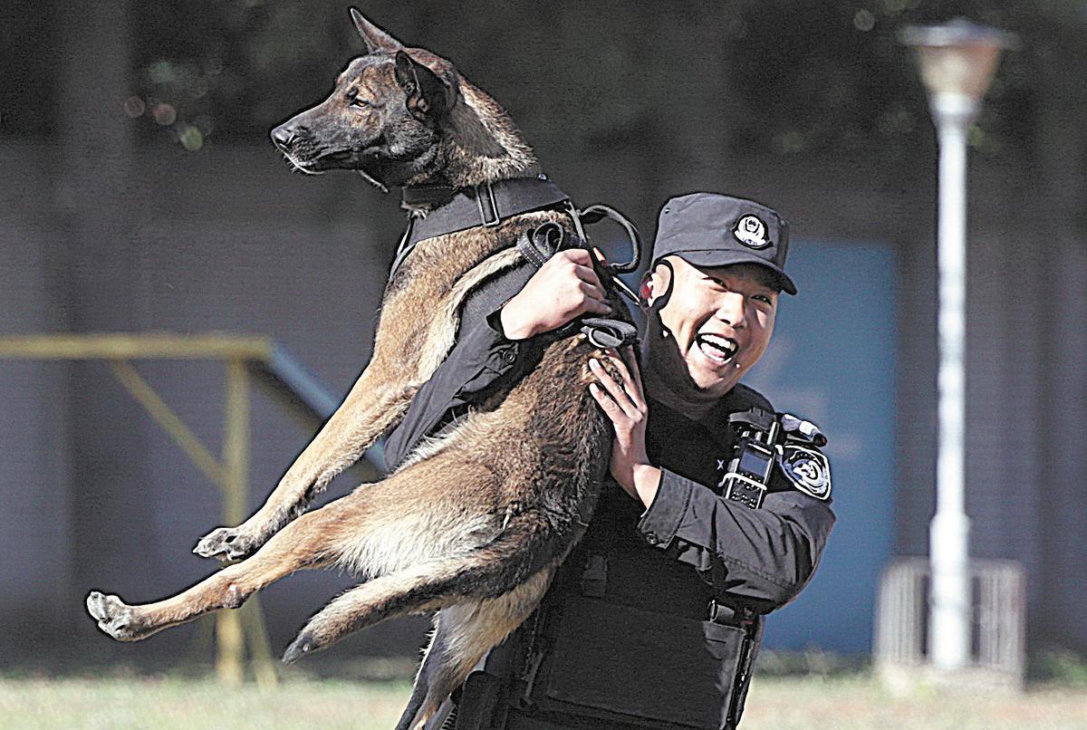 A police officer carries his dog after they participated in a police dog skills competition in Beijing on Oct 26, 2025. Organized by the Beijing Municipal Public Security Bureau's criminal investigation division, 19 teams with 125 competitors and 108 dogs from various divisions in the capital took part in the event. ZHANG YUWEI/XINHUA