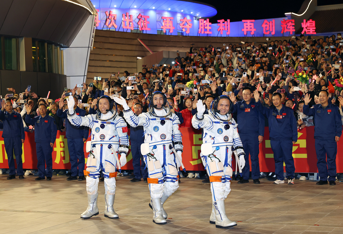 The three astronauts of China's 16th manned spaceflight, the Shenzhou XXI mission, headed to the launch tower on Friday evening after a see-off ceremony in front of their residential building at the Jiuquan Satellite Launch Center in northwestern China.