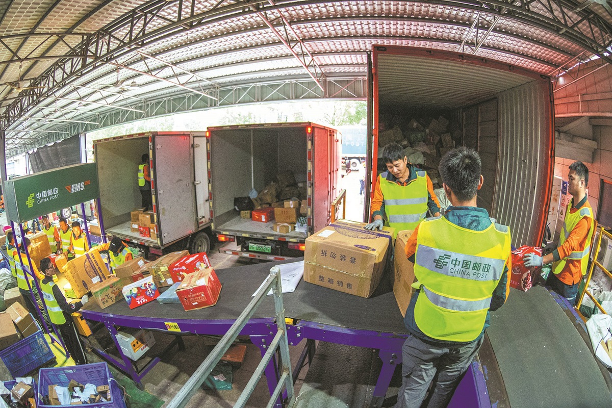Workers sort parcels at a local branch of China Post in Jinhua, Zhejiang province, Nov 4, 2025. With major e-commerce platforms launching the "Double 11" online shopping promotions, the express delivery and logistics sector has entered the peak period of the year. CHEN JUN/FOR CHINA DAILY