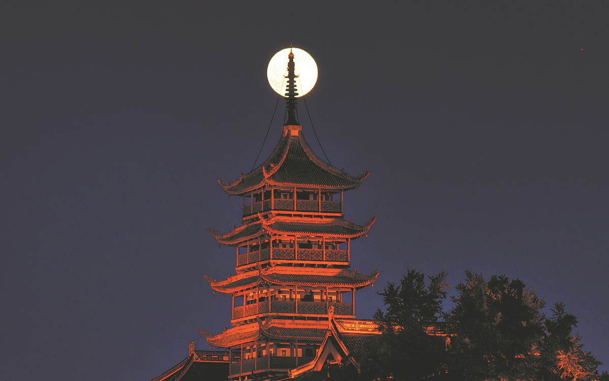 A "supermoon" illuminates the night sky over Zhiyun Pagoda in Langshan National Forest Park in Nantong, Jiangsu province, on Nov 5, 2025. The supermoon, the biggest full moon of the year, appeared perfectly round at around 9:19 pm on Wednesday. XU CONGJUN/FOR CHINA DAILY