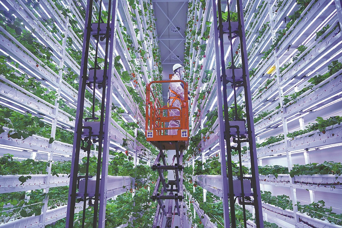 Staff members tend to strawberry plants using a vertical lift at a super plant factory in Wenjiang district, Chengdu, the capital of Sichuan province, on Nov 4, 2025. ZHANG LANG/CHINA NEWS SERVICE