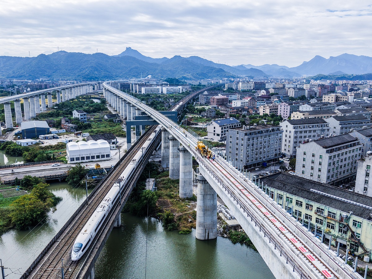 An aerial drone photo shows workers operating at the track laying construction site of the Wenling-Yuhuan section of Hangzhou-Taizhou high-speed railway in Taizhou, East China's Zhejiang province, Nov 5, 2025. [Photo/Xinhua]