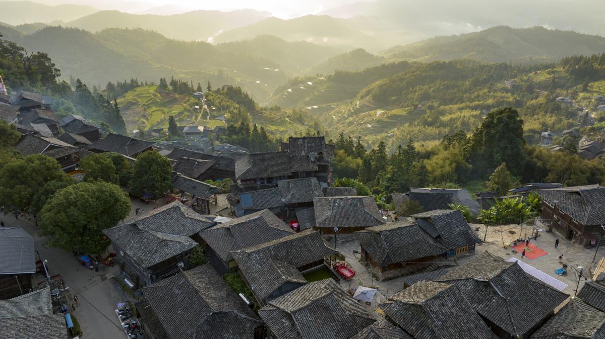 An aerial photo captures Basha Miao village in Congjiang county, Guizhou province, bathed in the warm glow of early-winter sunlight. [Photo by Wu Dejun/For chinadaily.com.cn]
