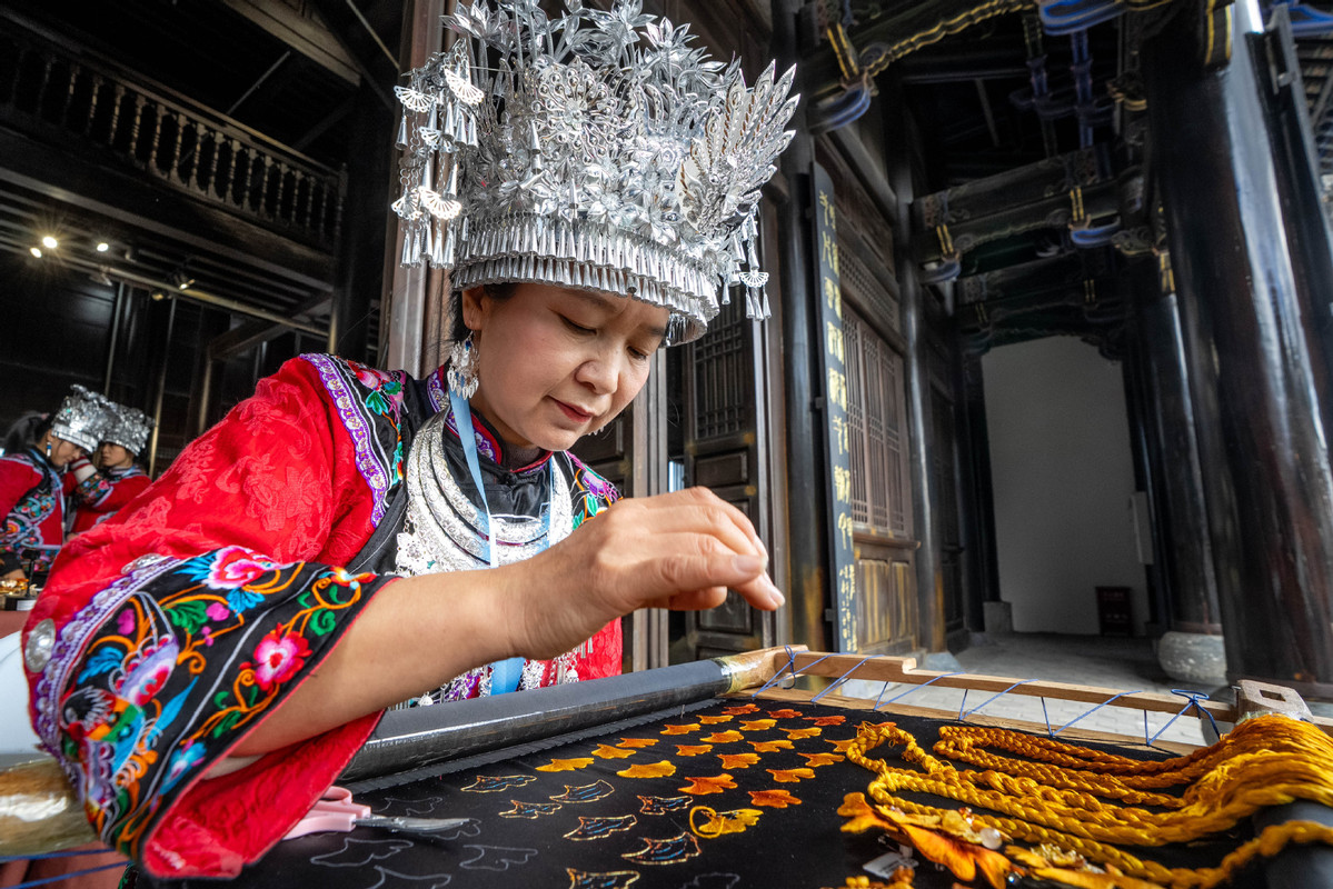 Chen Guotao, a city-level inheritor for Miao Embroidery, shows her skills during a promotion week for intangible cultural heritage brands in Dali, Southwest China's Yunnan province, Nov 23, 2025. [Photo/Xinhua]