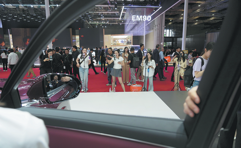 Saleswomen detail the merits of automobiles at the 21st Shanghai International Automobile Industry Exhibition on April 24. ZHANG HENGWEI/CHINA NEWS SERVICE