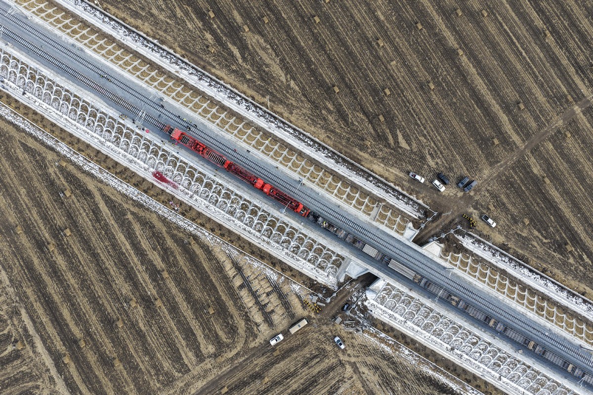 An aerial drone photo taken on Nov 25, 2025 shows a construction site of the Harbin-Yichun high-speed railway in Qing'an county, Northeast China's Heilongjiang province. [Photo/Xinhua]
