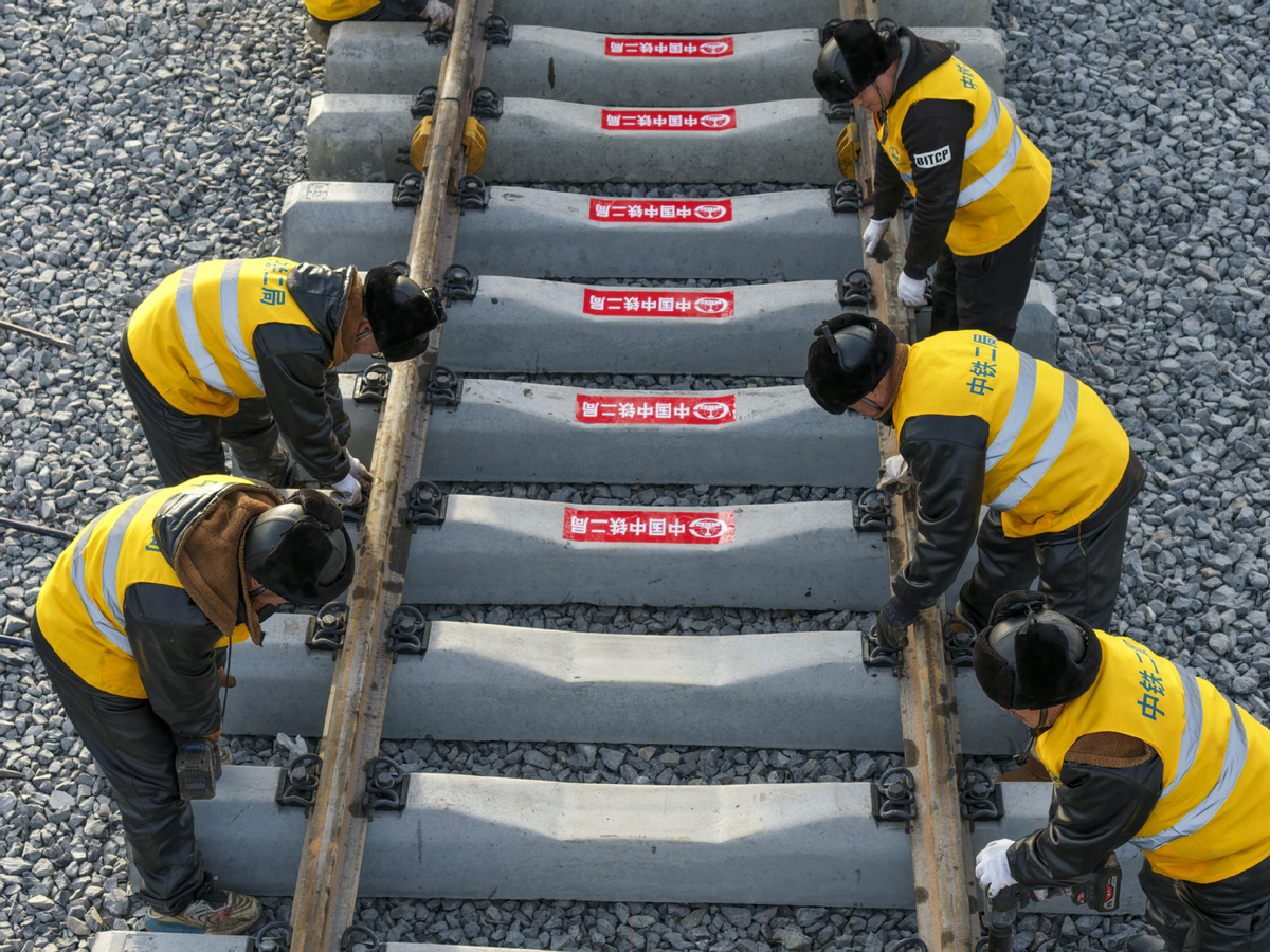 An drone photo taken on Nov 25, 2025 shows constructors working at a construction site of the Harbin-Yichun high-speed railway in Qing'an county, Northeast China's Heilongjiang province. [Photo/Xinhua]