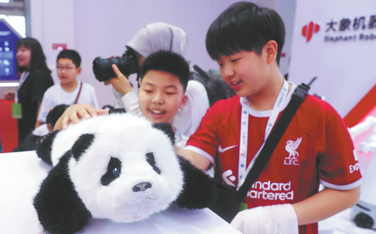 Young visitors pet a panda-shaped companion robot at the 2024 World Robot Conference in Beijing on Aug 21, last year. CHEN XIAOGEN/FOR CHINA DAILY