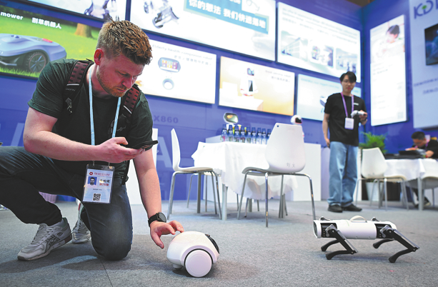 An exhibitor takes pictures of teaching and companion robots at the 137th Canton Fair in Guangzhou, Guangdong province, on April 15. DENG HUA/XINHUA