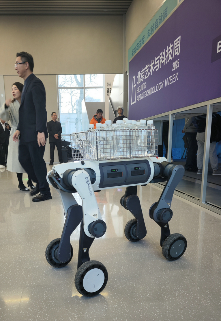 A robot dog delivering water at the opening ceremony of the 2025 Beijing Technology and Art Week on Friday. [Photo by Yang Xiaoyu/chinadaily.com.cn]