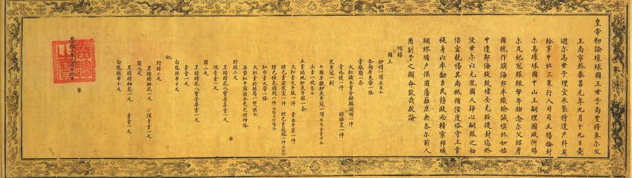 In the 11th year of Emperor Shunzhi's reign (1644-1661), King Shang Zhi of Ryukyu sent envoys to Beijing to return "two old imperial edicts, one imperial decree and a gilded silver seal", and to request new investiture documents and seals.