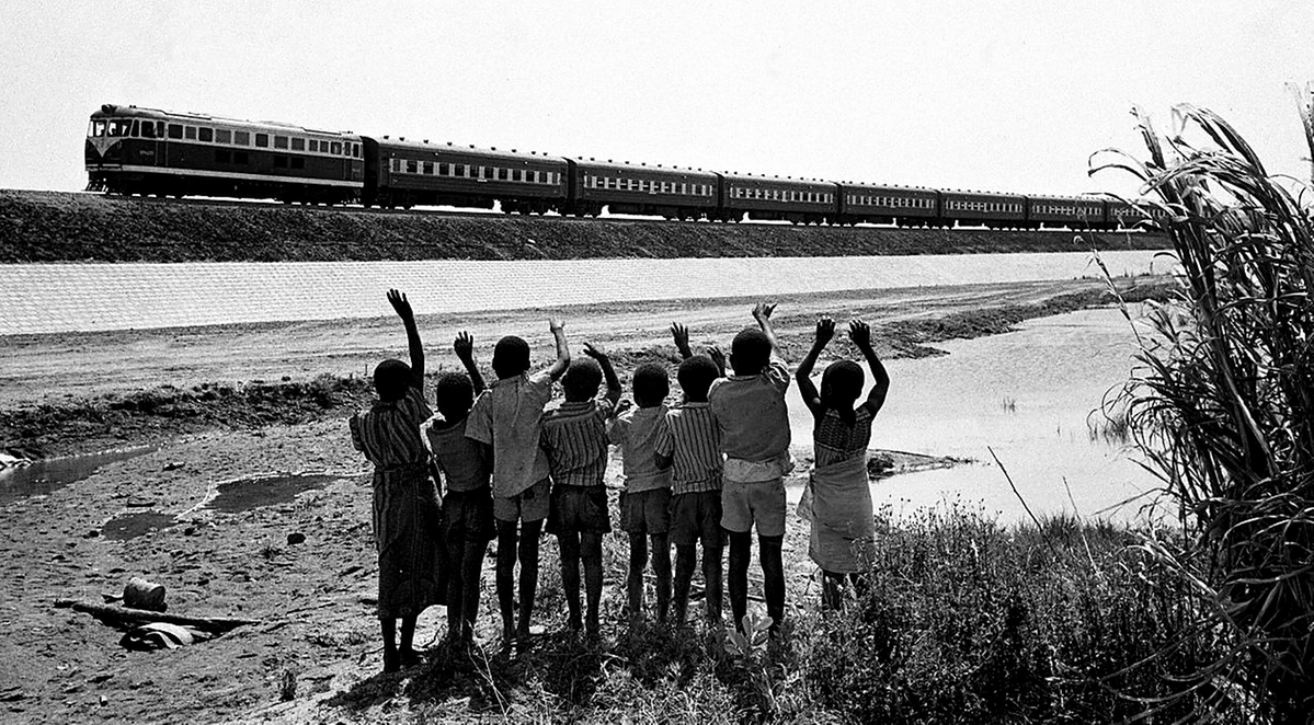 Children standing by Lake Rukwa in Tanzania cheer as a train running on Tanzania-Zambia Railway reaches their hometown in 1976. XINHUA