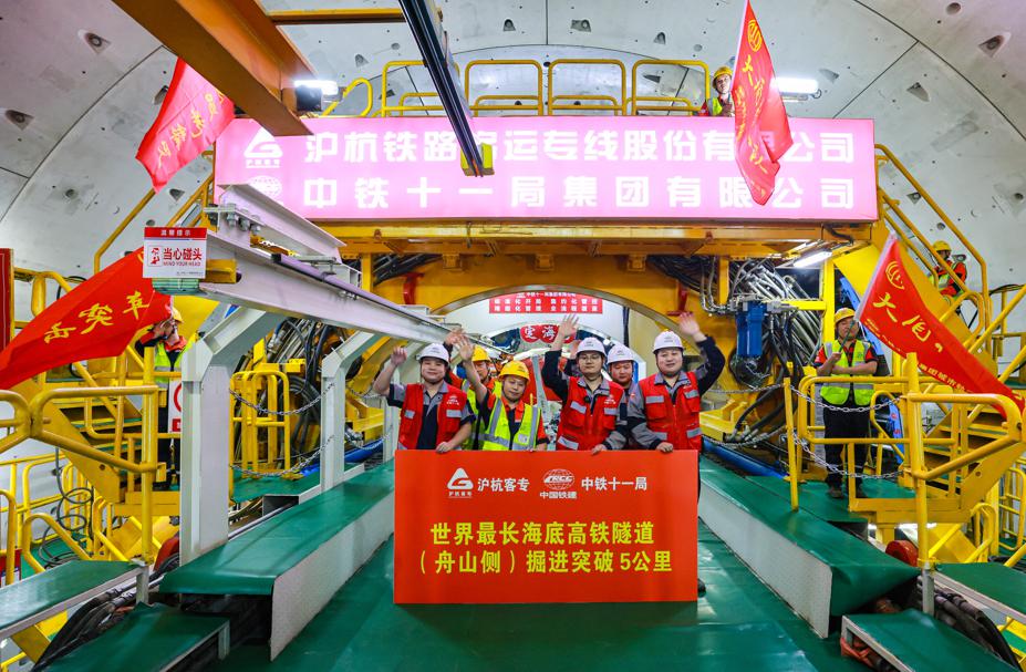 The construction team celebrates the "Dinghai" Shield Machine surpassing 5 kilometers of excavation. [Photo provided to chinadaily.com.cn]