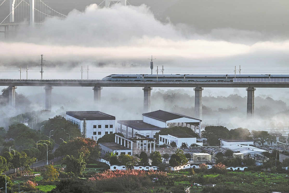 A high-speed train passes over a bridge along the Panzhou-Xingyi High-Speed Railway in Southwest China's Guizhou province on Nov 28, 2025. [Photo/Xinhua]