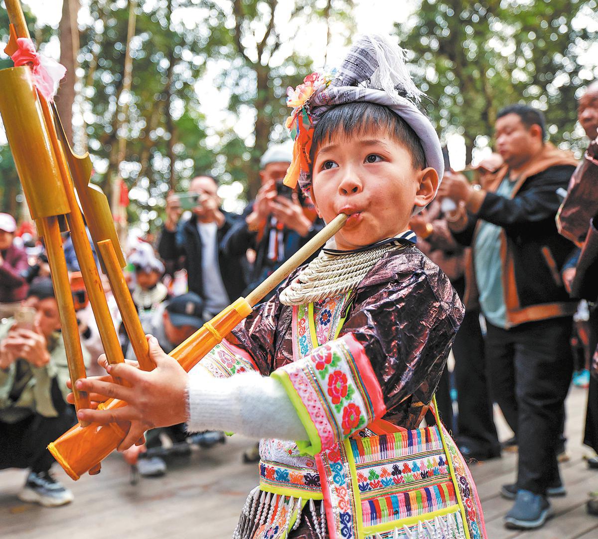 A boy from the Miao ethnic group plays lusheng, a reed-pipe wind instrument, during the annual Lusheng Festival in Basha Miao village located in the mountainous area south of Congjiang county, Guizhou province, Dec 8, 2025. LIANG HUIBO/FOR CHINA DAILY