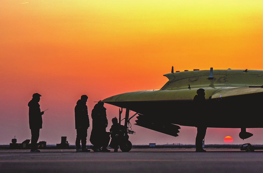 Workers perform maintenance on the CH-7 high-altitude, high-speed stealth drone ahead of its maiden flight in northwestern China. TAO RAN/FOR CHINA DAILY