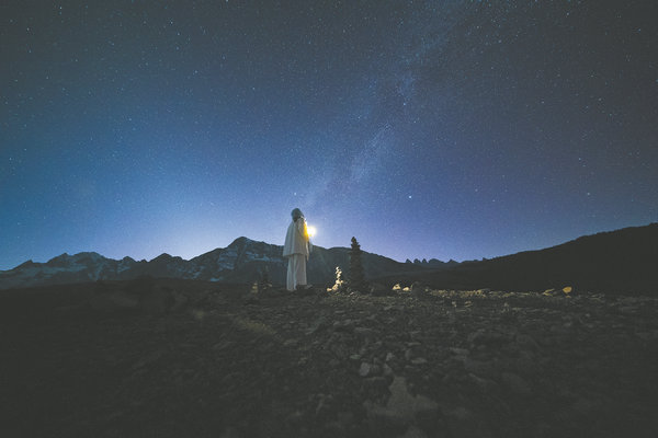 Gao Qiuhong under a star-filled sky at Yak Meadow in Lijiang. [Photo provided to China Daily]